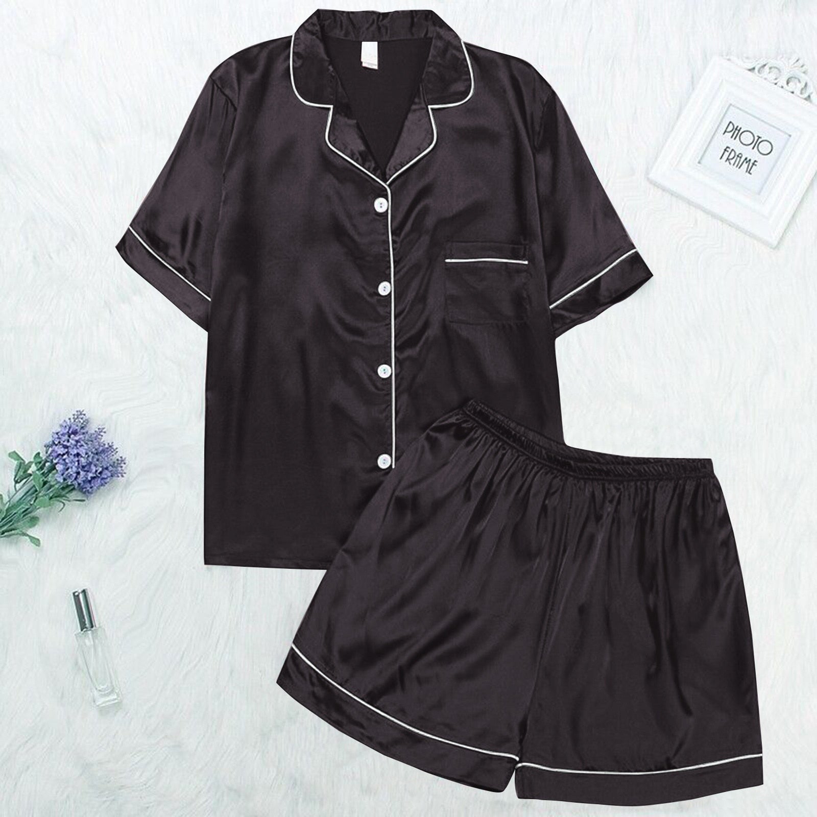 • Genießen Sie erholsame Nächte in diesem stilvollen Satin-Pyjama!