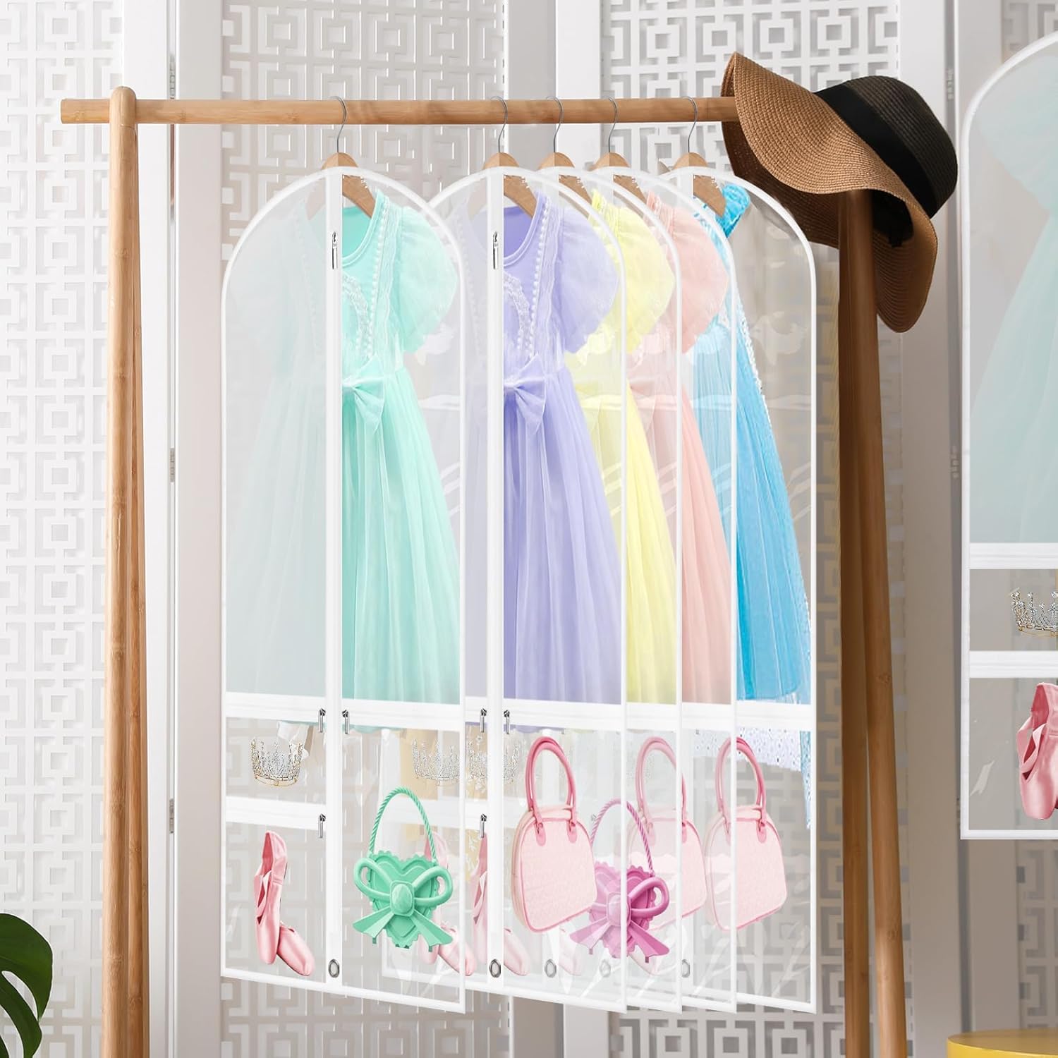 Schütze deine Kostüme und halte deine Accessoires sortiert mit diesem 5er-Pack faltbarer Kleidersäcke – jetzt mit einem zusätzlichen Set gratis. Hergestellt aus atmungsaktivem PEVA+PVC, schützen diese Taschen deine Tanz- oder Festkleidung vor Staub und Feuchtigkeit. Jede Tasche hat ein klares Sichtfenster an der Vorderseite zur einfachen Identifizierung sowie drei Reißverschlusstaschen zur Aufbewahrung von Schuhen, Haarschmuck und kleinen Utensilien. Durch die untere Öse lässt sich die Tasche für den einfachen Transport zusammenfalten – ideal für Reisen, Wettbewerbe oder die Garderobenorganisation.