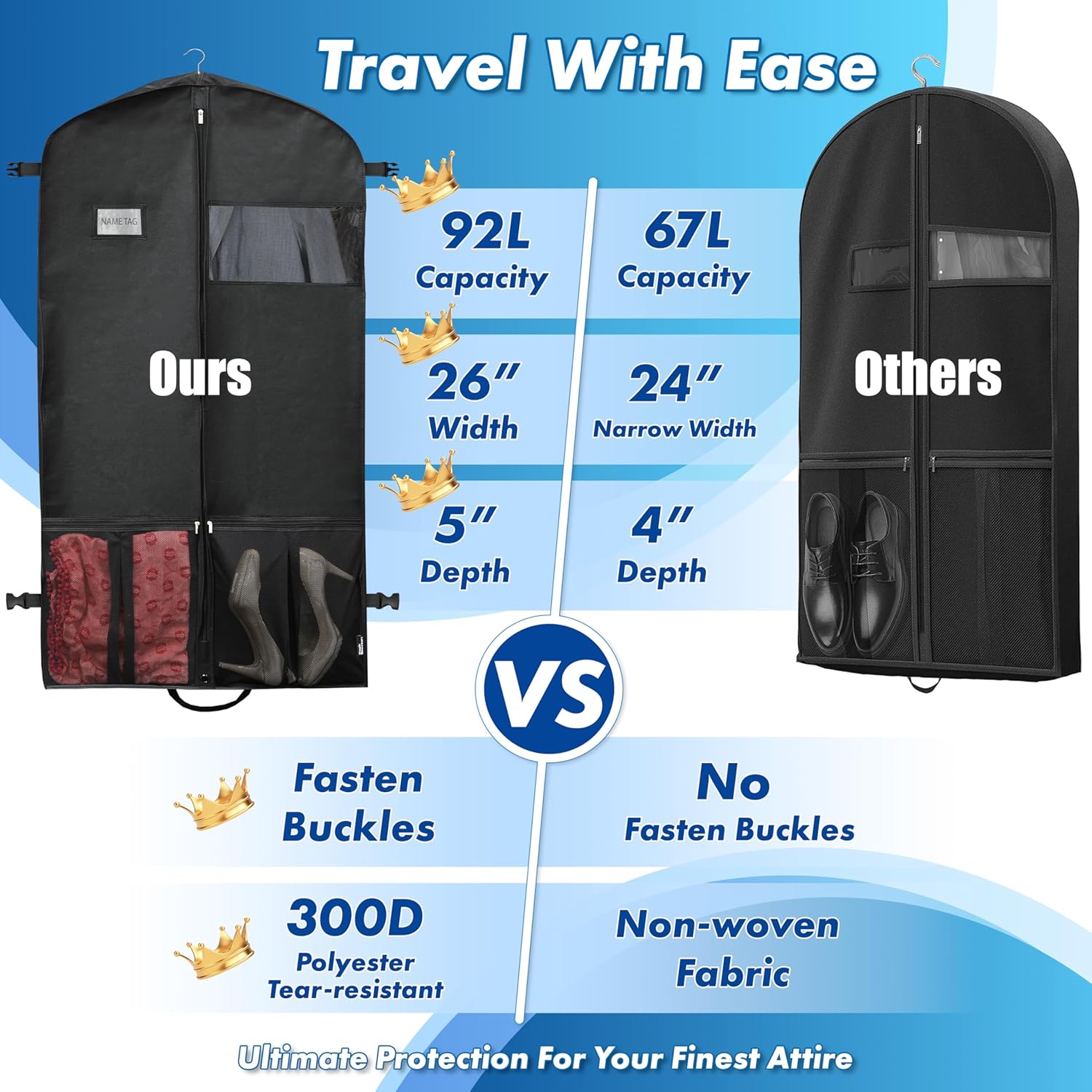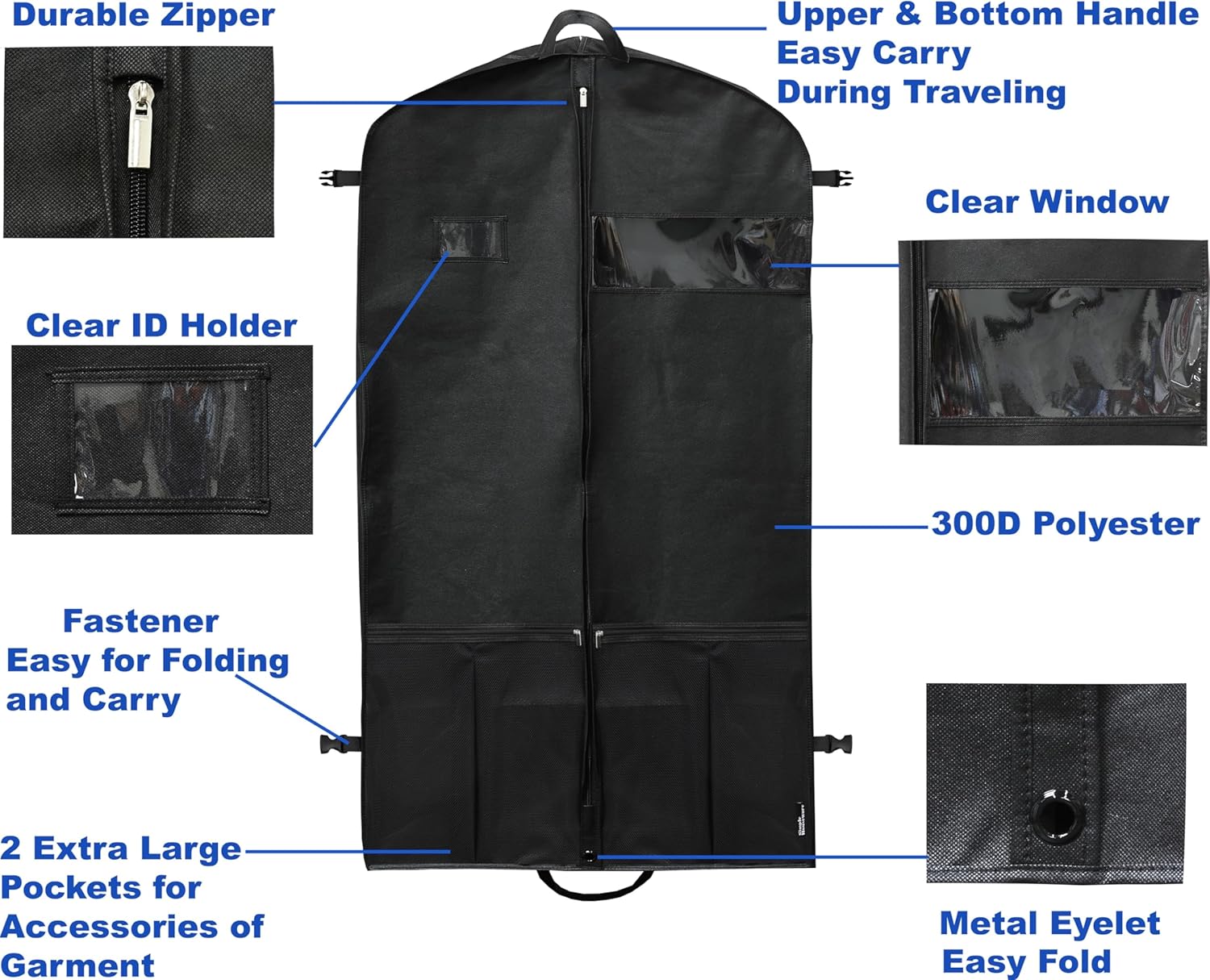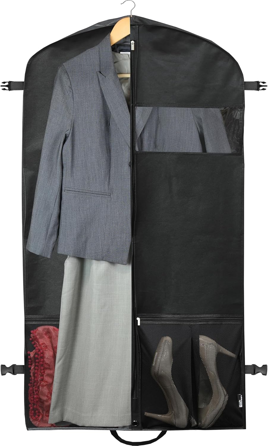 Diese strapazierfähige Kleidungstasche ist ideal für Anzüge, Smokings, Kleider, Abendroben, lange Mäntel und mehr. Das extra breite Design ermöglicht es, mehrere Kleidungsstücke in einer Tasche aufzubewahren, während das reißfeste, staubfreie und wiederverwendbare Material für eine lange Lebensdauer sorgt. Das transparente Sichtfenster und das ID-Fach machen die Identifizierung des Inhalts einfach, und zwei extra große Zubehörfächer sind perfekt für Schuhe oder Reiseutensilien. Mit stabilen Griffen, einer Öse zum Falten und einem hochwertigen Reißverschluss ist sie die ultimative reisefreundliche Lösung für die Kleideraufbewahrung.
