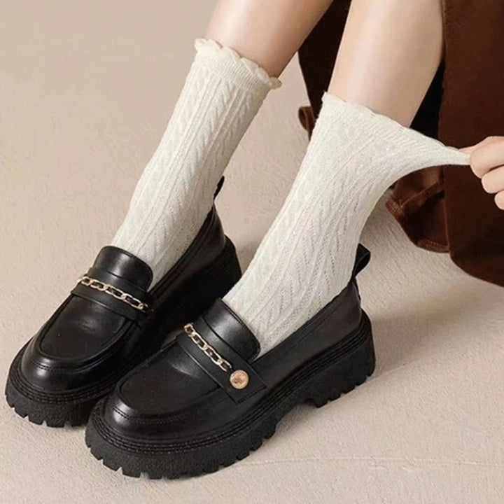 Die Trachtensocken Hazel bietet 6 Paar gestrickte, mittellange Strümpfe mit modischen, vielseitigen Spitzen- und Rüschensocken im Vintage-Stil. Diese Socken sind eine stilvolle Ergänzung für verschiedene Outfits und verleihen einen Hauch von Nostalgie und Eleganz.