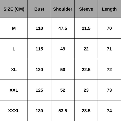 | Größe | Brustumfang | Schulterbreite | Ärmellänge | Gesamtlänge |