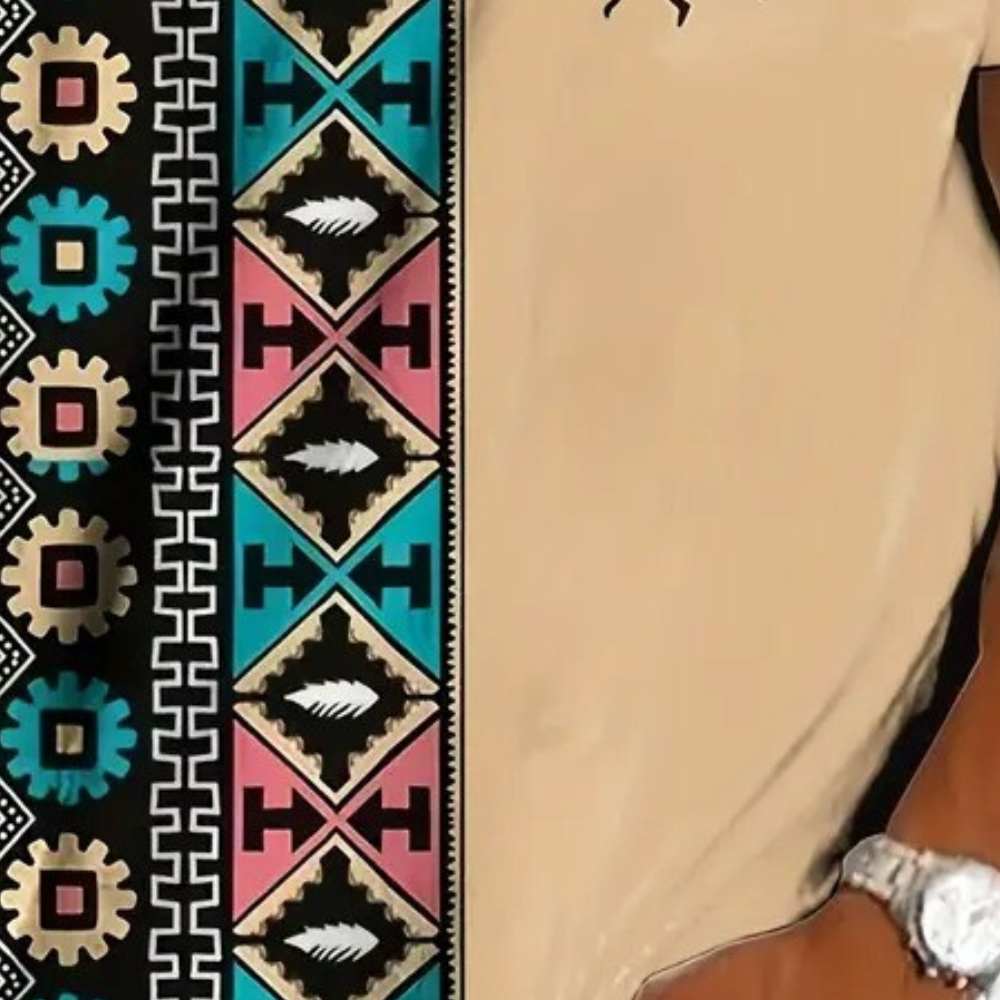 Beiges T-Shirt mit buntem, ethnischem Muster, Kurzarm, Unisex, Baumwolle, Freizeitmode.